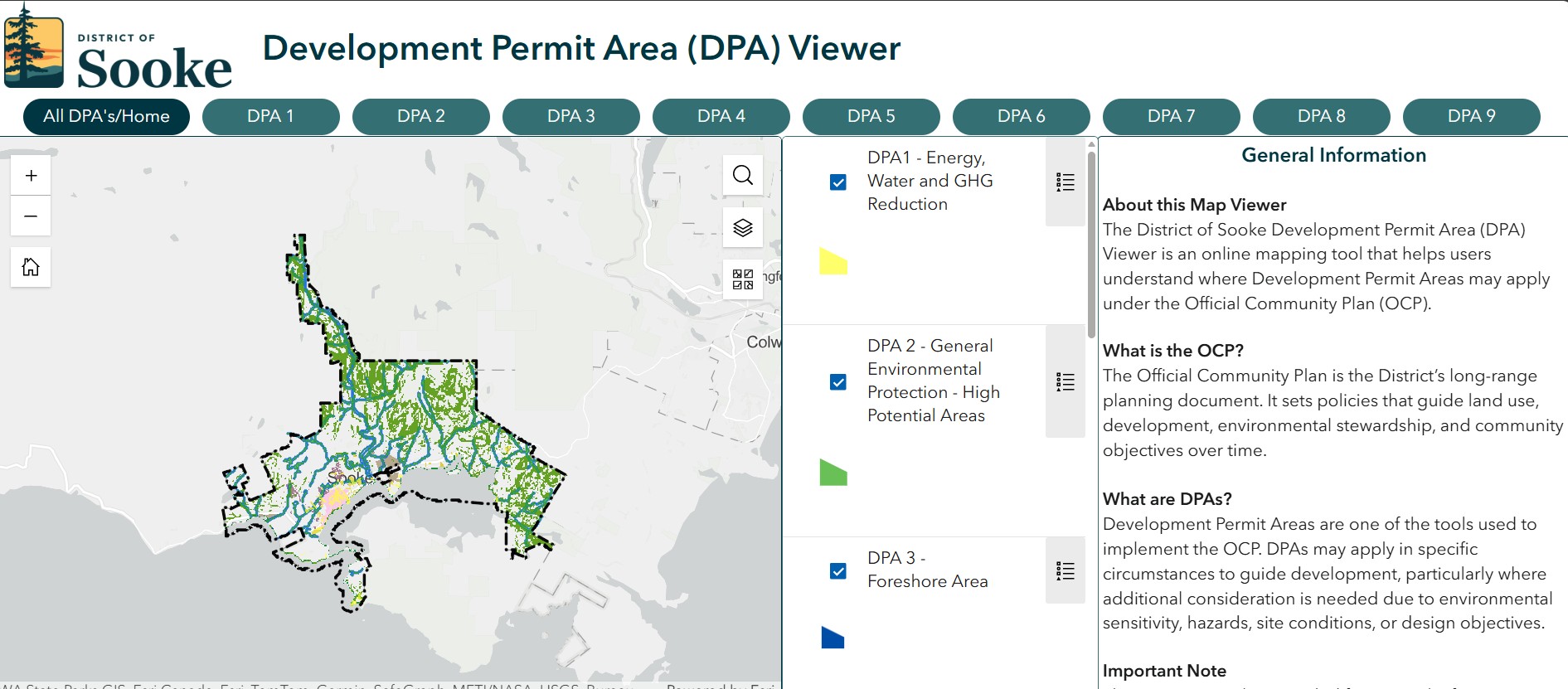 The District of Sooke has launched a new Development Permit Area (DPA) Viewer, an online mapping resource designed to support early implementation of the District’s Official Community Plan (OCP), adopted by Council on December 8, 2025.