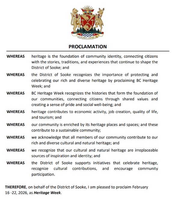 Heritage is the foundation of community identity, connecting residents with shared histories, traditions, and experiences. Through the proclamation of Heritage Week, the District of Sooke reaffirms its commitment to protecting and celebrating its rich and diverse cultural and natural heritage.